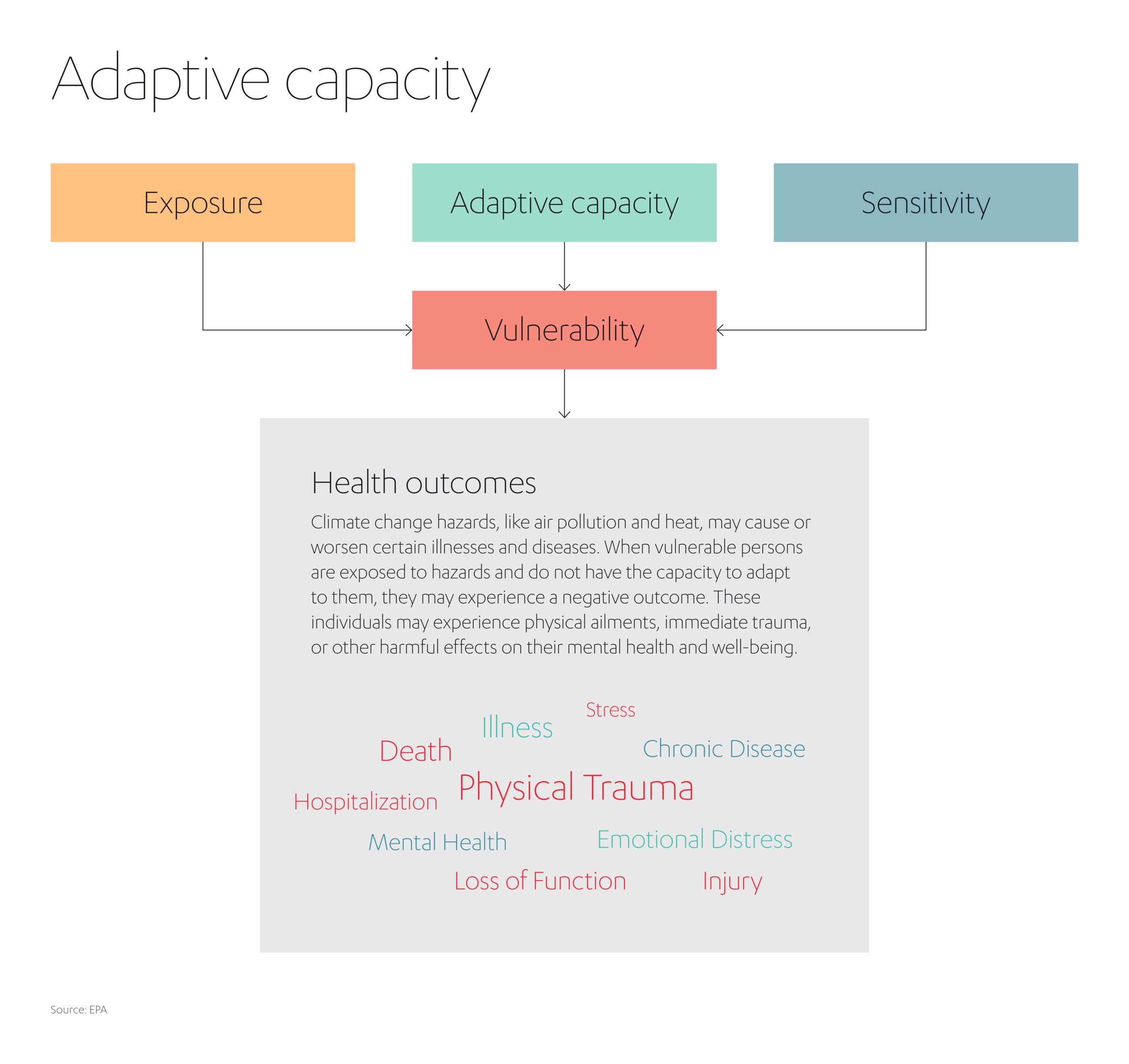 美国环境保护署 (EPA) 制定了一个评估框架,以此明确了决定个人对气候变化的脆弱性的三个关键因素: