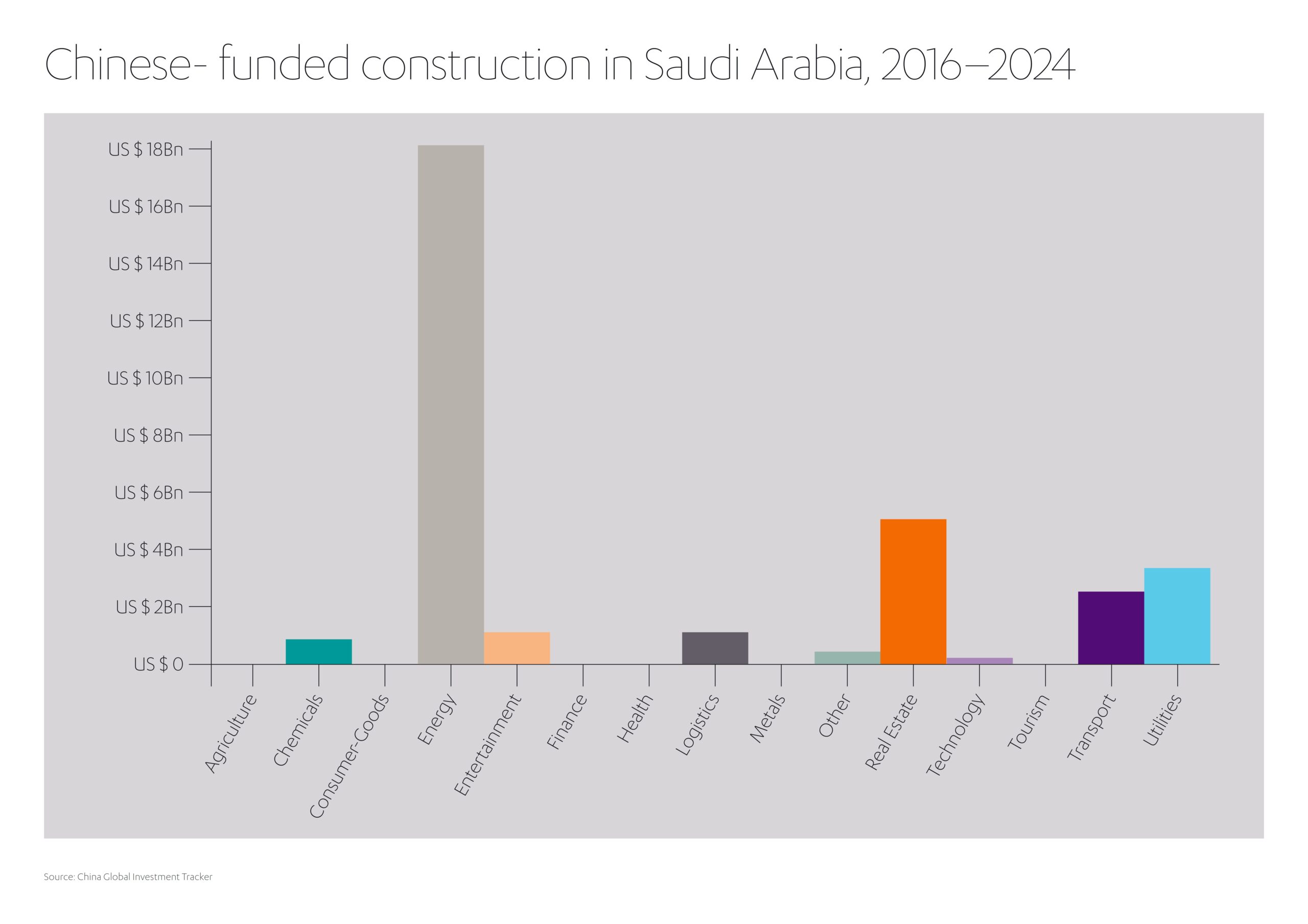 自 2016 年以来,中国对沙特“2030 年愿景”的支持导致了投资激增。2005 年至 2024 年 6 月期间,中国对沙特基础设施项目投资 540 亿美元。其中大部分是在 2016 年至 2024 年期间拨付的。在此期间,中国在沙特阿拉伯的总投资额达 140 亿美元——其中 2019 至 2024 年间投资 90 亿美元。[9]