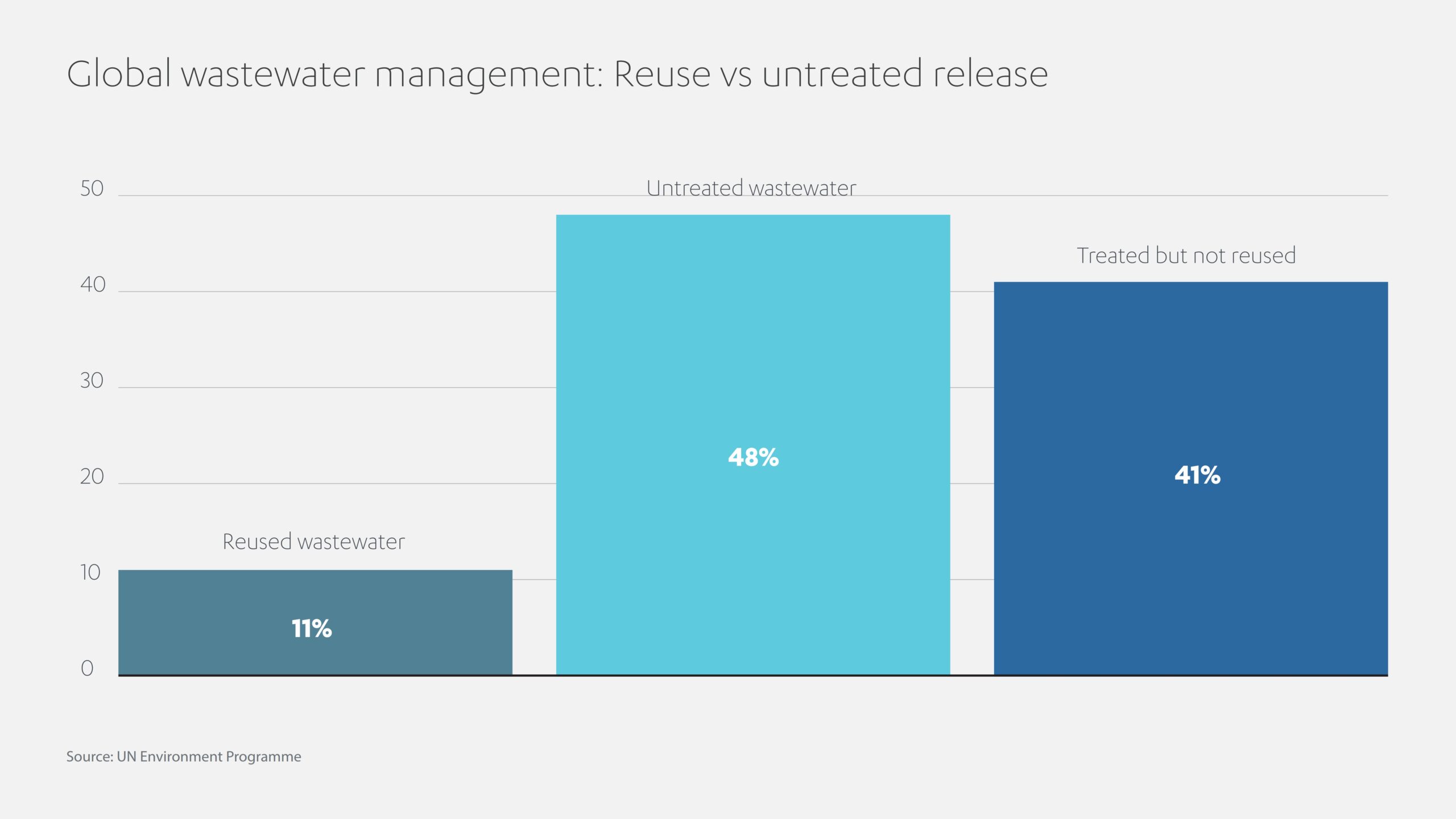 据联合国环境规划署估计,目前,在全球生活和工业废水总量中,仅有约 11% 得到了再利用,估计仍有 48% 的废水未经处理就直接排入到了环境当中