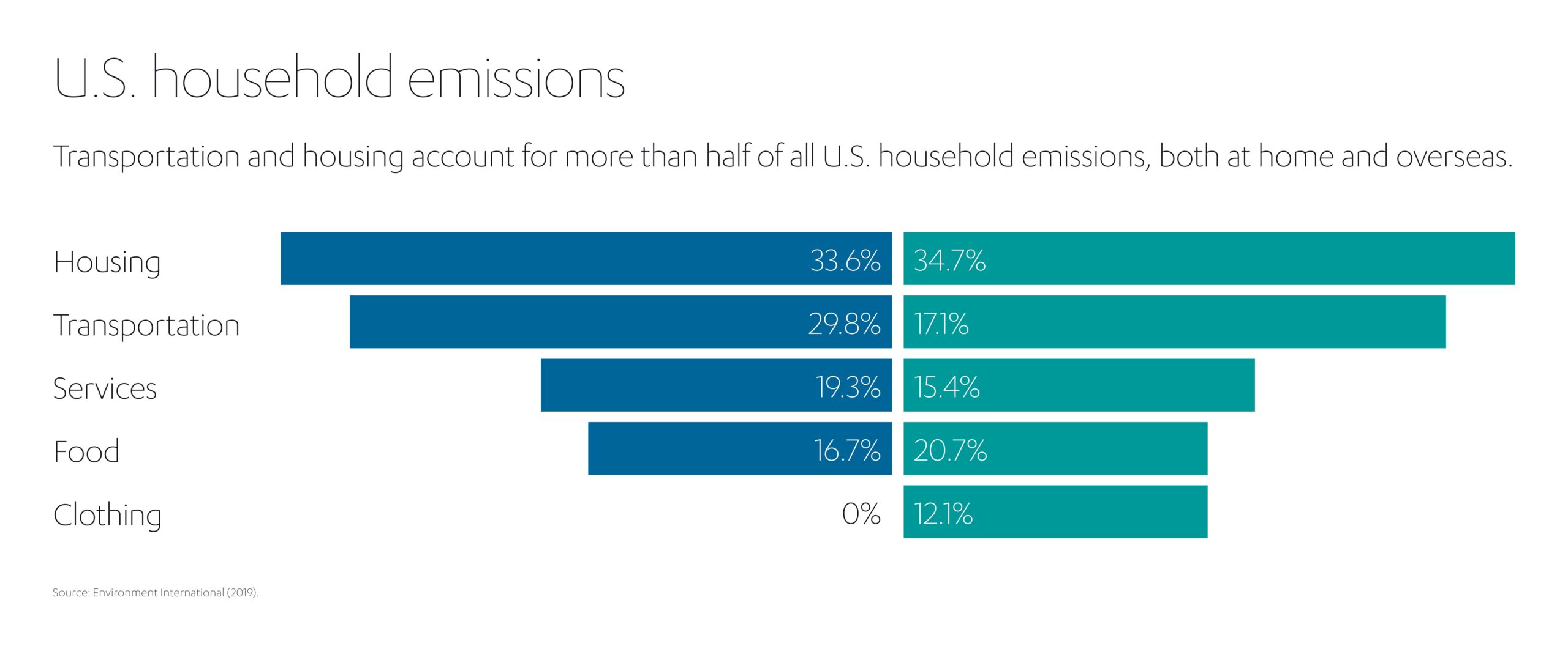 超过四分之一 (27%) 的美国家庭的海外碳足迹来自中国,加拿大、印度、俄罗斯和墨西哥也贡献了很大比例。从不同类型的家庭消费来看,美国家庭购买服装的碳足迹约 70% 至 85% 产生于海外,约三分之二 (65%) 的排放是由电子产品支出造成的。
