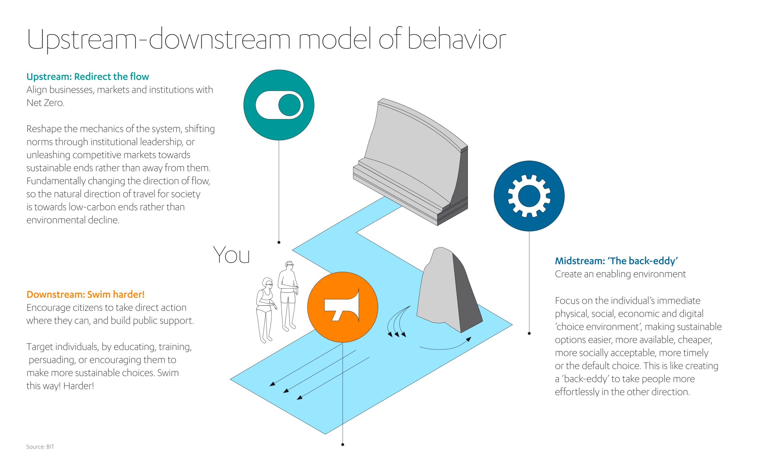 BIT 不侧重于直接针对个人的“下游”干预措施,而是强调人在其中做出选择的“中游”环境,以及最终创造这些环境的“上游”因素。它认为,通过以这种方式瞄准人所处的环境,“更加环保的行为自会蓬勃发展”。