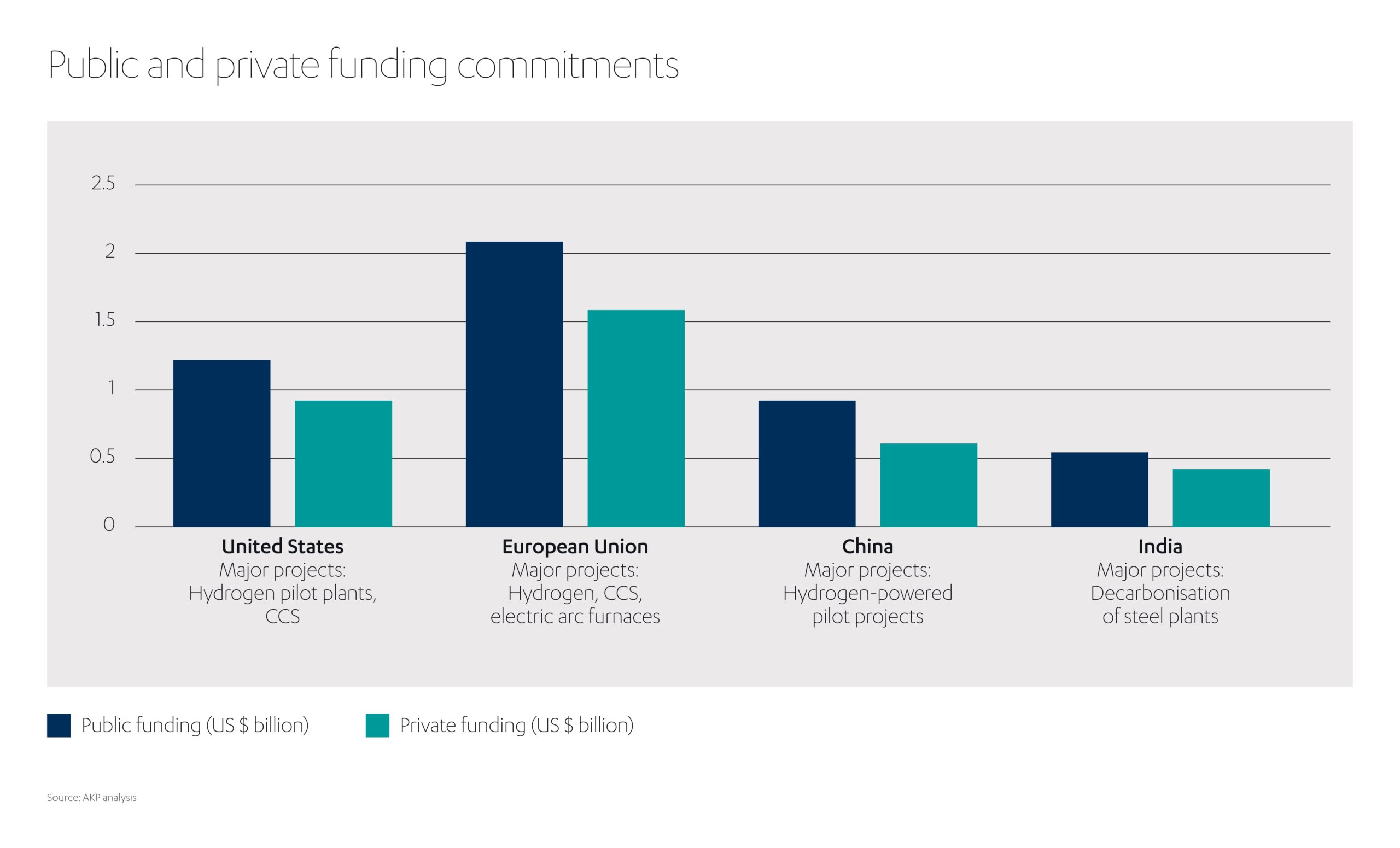 According to analysis by research and technology solutions firm Acuity Knowledge Partners, governments appear to be stepping up to the (steel) plate by putting up funds to support decarbonizing efforts[26] (see graph).