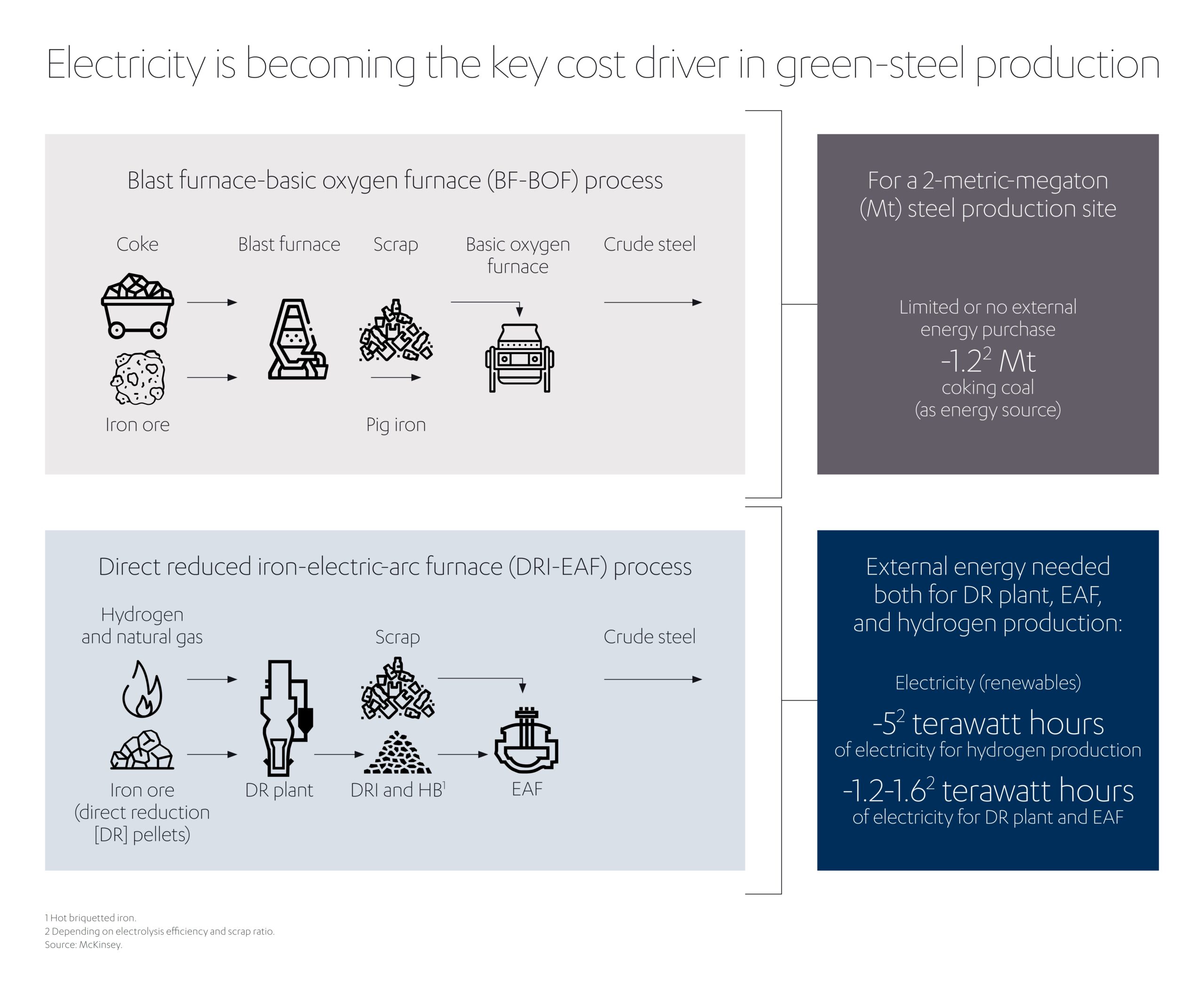 - Melting the resulting iron in electric arc furnaces powered by renewable electricity.