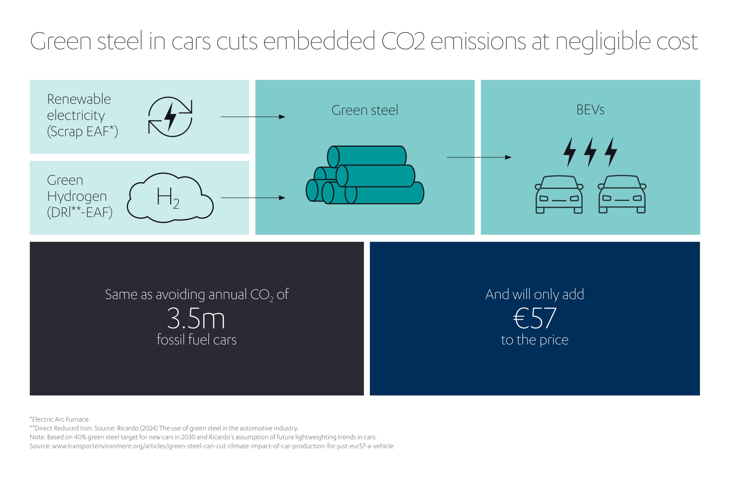 Transport & Environment estimates that switching to 40% green steel would add only €57 to the price of an electric vehicle in 2050.