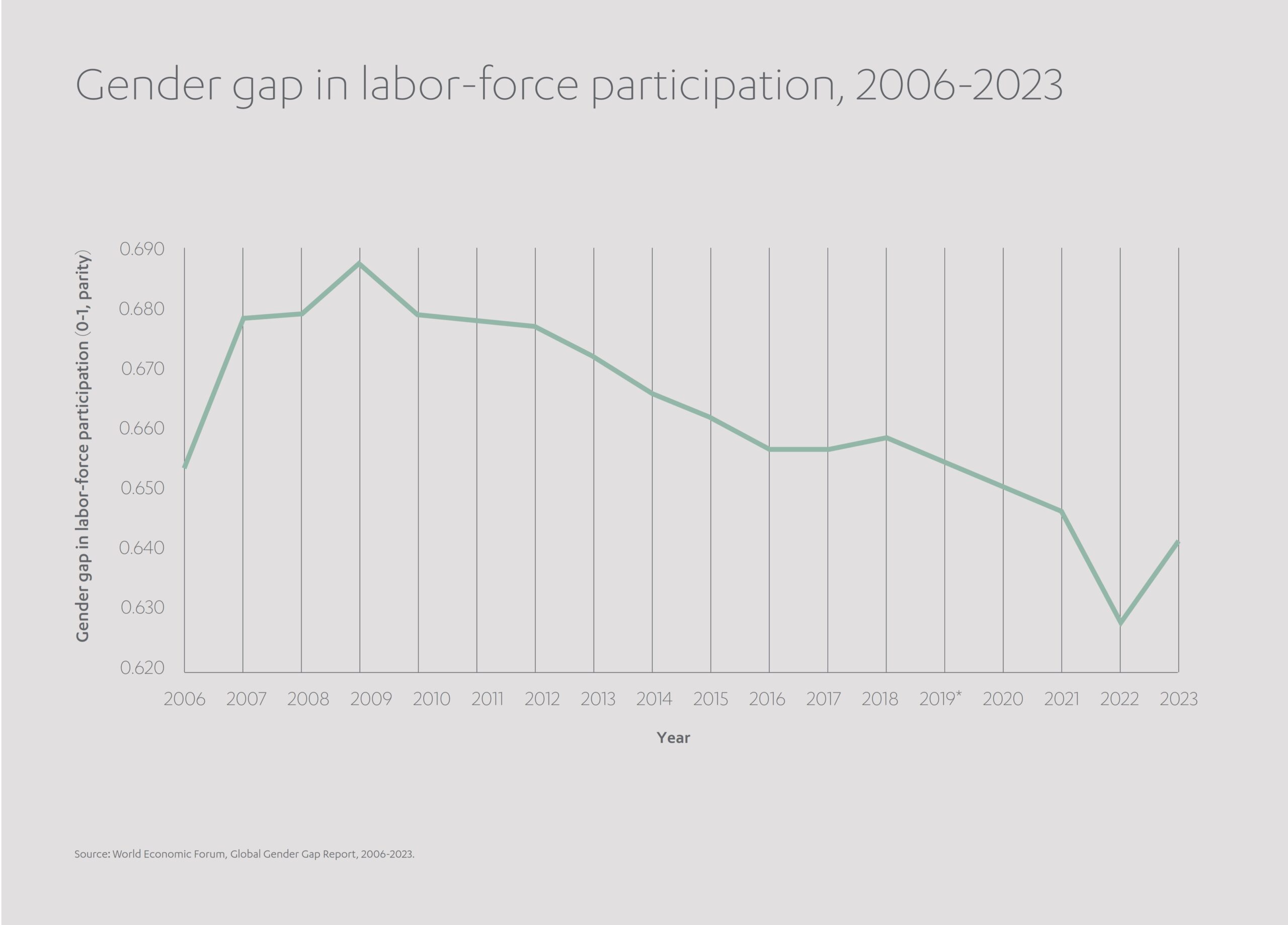 After declining in the years following the 2008 worldwide economic crash, gender parity in the labor force worldwide increased from 63% to 64% during 2023.[4]