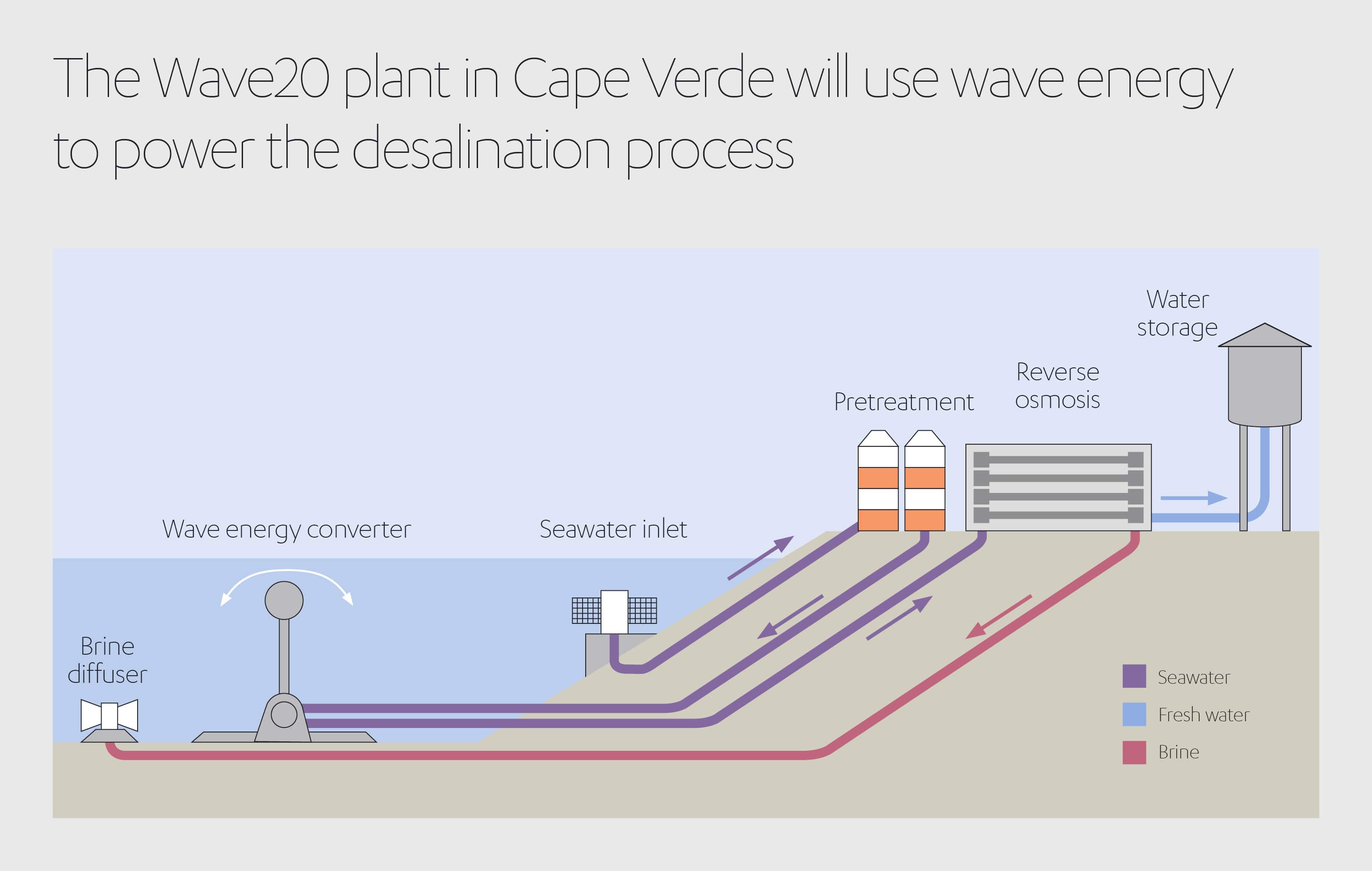 Les mers sont une source illimitée d’énergie cinétique. Une vague moyenne de 1,2 mètre et 10 secondes frappant une côte produit plus de 35 000 chevaux par mile de côte.[19] L’énergie des vagues est difficile à exploiter,[20] mais il y a eu un pilote prometteur en Australie occidentale. En 2014, Garden Island est devenu le premier « projet houlomoteur à échelle commerciale au monde à démontrer à la fois la production d’énergie et d’eau douce à partir des vagues de l’océan », selon Water Technology.[21] Un système de dessalement houlomoteur est également prévu au Cap-Vert, au large de la côte ouest de l’Afrique. Le développeur, Resolute Marine Energy, affirme que la centrale appelée Wave20 produira de l’eau potable à un tiers du prix des systèmes conventionnels. Le système exploite l’énergie des vagues pour pressuriser l’eau et la pomper vers une centrale de traitement à terre, tandis qu’une série de pagaies se déplace d’avant en arrière par les vagues pour créer de l’électricité qui est utilisée pour filtrer l’eau de mer.[22]